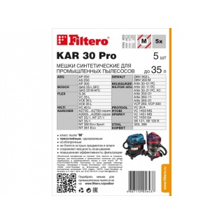 Мешки для промышленных пылесосов Filtero KAR 30 Pro, 3-х слойные, произведены из синтетического микроволокна MicroFib®. Прочность синтетических мешков Filtero KAR 30 Pro превосходит любые бумажные мешки-аналоги, даже если это оригинальные бумажные мешки всемирно известных марок. Вы можете быть уверены: заклепки, гвозди, шурупы, битое стекло, острые камни и пр. не смогут прорвать мешки Filtero Pro. Мешки Filtero Pro не боятся влаги, и даже вода, попавшая в мешок, не помешает вам произвести качественную уборку!